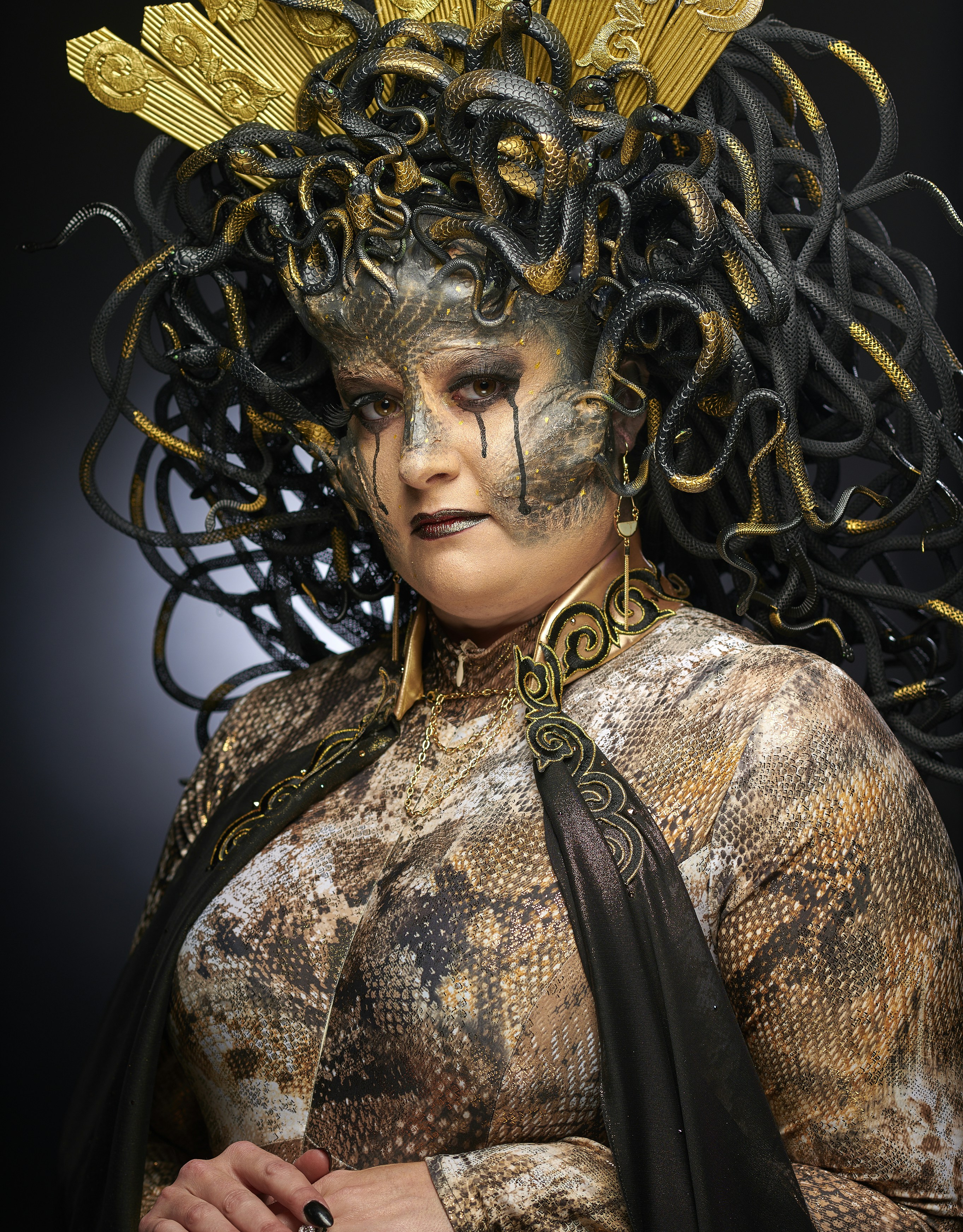 Medusa was a scareactor that appeared in the halloween horror nights: She also appeared in the curse of pandora's box maze during halloween horror nights 2019 (hollywood) and halloween horror nights 2021 (hollywood). Then, like the headpiece, spray painted them with both colors. Be queen of the snakes in the medusa women's costume. Alles für ein schauriges halloween! I've not been feeling well. Product title suit yourself medusa halloween costume for girls, in. Holy crow, blind mask, fantasy mask, goth crown, gothic mask, gothic headpiece, medusa costume, gothic crown / made to order. 4.1 out of 5 stars 18. Hot glue the snakes all over the headband so that they go straight up. This long dress featuring a reptilian print and a train reminiscent of a snake's slithery tail adds a sultry flair but the elaborate headpiece decorated by a bronze snakes will cause serious envy. I attached mine on either sides of the headband and in the middle i inserted the ends into the holes of the top of the headband and glued them. Only 1 available and it's in 5 people's carts.
